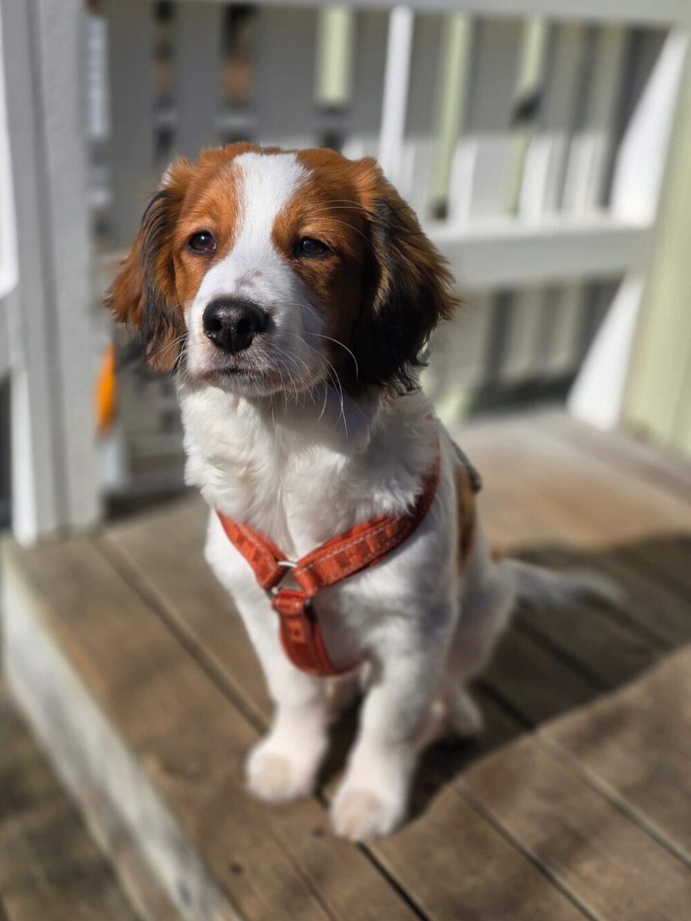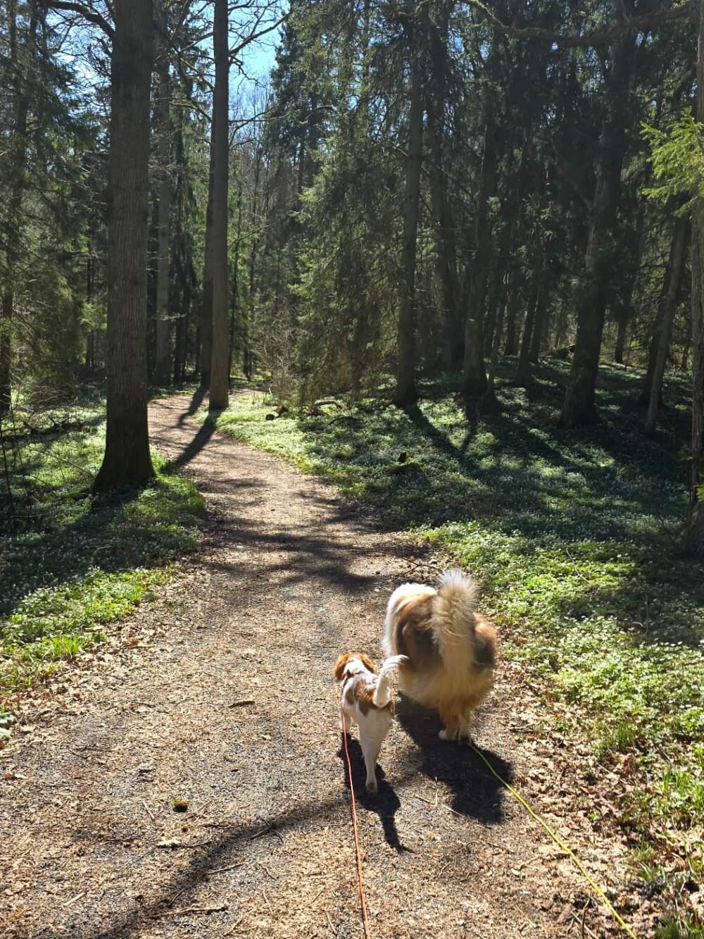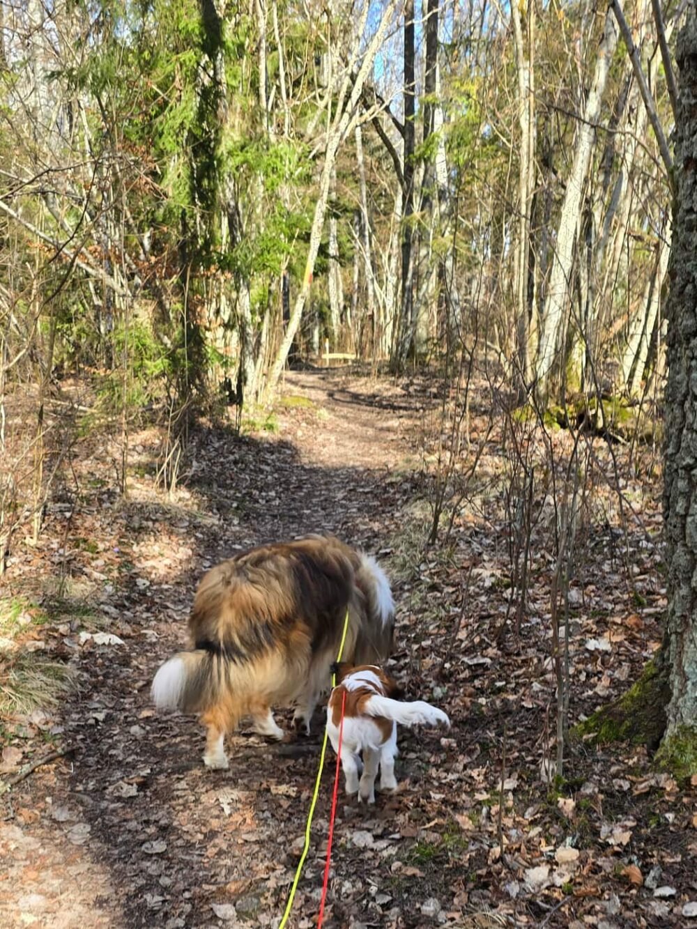 Felix är lite större nu, och är inte lika orolig att inte vara nära så han får, liksom Ville, ha en långlina på sig när vi är ute och går i skogen.