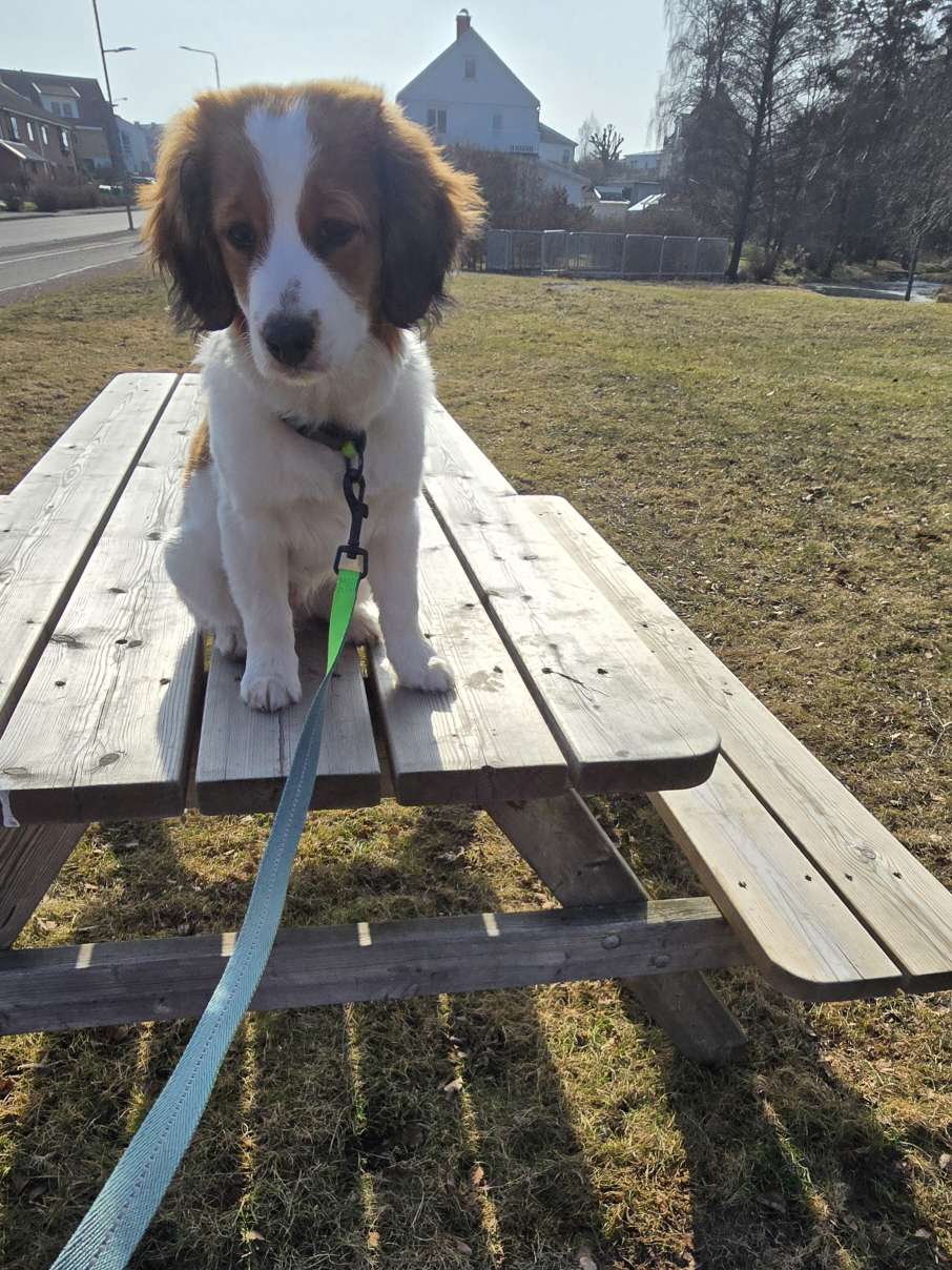 Jag går runt på olika promenader med Felix. Dels för att förhoppningsvis få hundmöten som vi kan jobba med, men också för att han ska lära sig att promenader kan innebära att gå till många olika ställen. Häromdagen stannade vi till vid Gandalfs bänk och satt där en stund i solen.