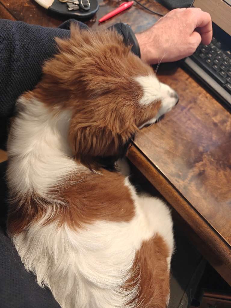 Här i knät på husse när husse arbetar. Börjar bli lite stor så han får ta hjälp av skrivbordet också.