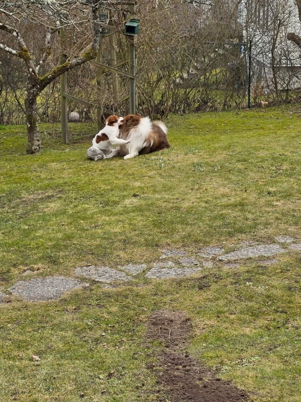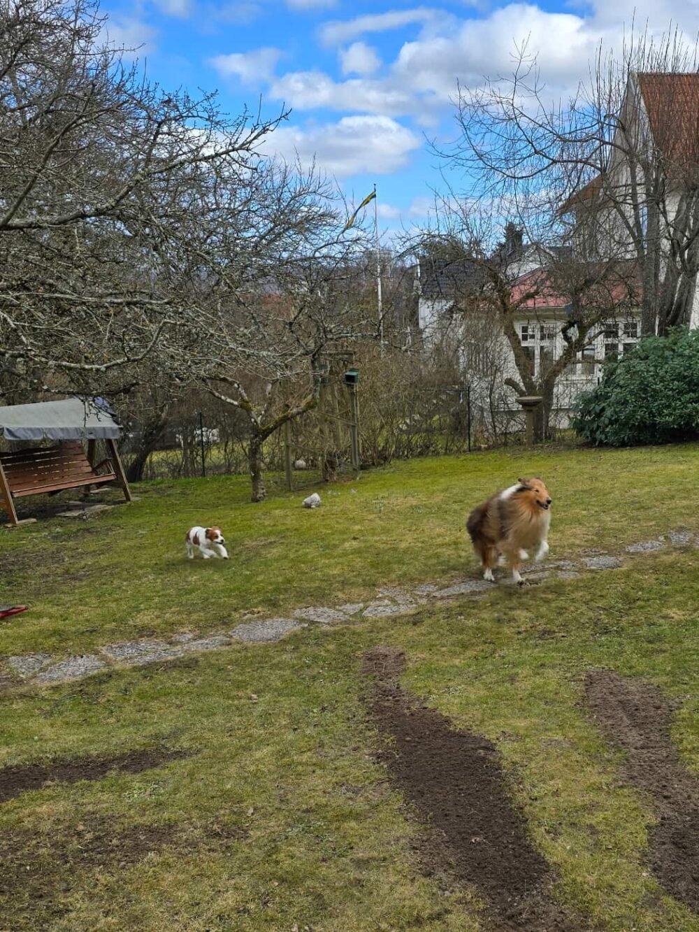 Långlina är bra. Hunden känner sig ganska fri och kan springa runt och jag kan hugga tag i linan om de skulle vara på väg någonstans. Eller göra den kort och hålla som ett koppel om vi skulle möta någon. Jag önskar jag var så duktig att jag hade en hund som kan gå lös överallt och lyda mig perfekt. Men jag är inte så duktig så långlina får gå bra.