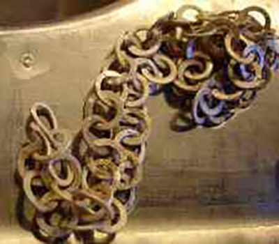 Här har vi hela kedjan ihoplödd. Till vänster syns också mitt lilla S-lås. Nu är inte halsbandet speciellt snyggt. Det är oxiderat och bränt efter all lödning. Ser nästan lite rostigt ut, inte sant? För att få bort det här lägger man ner halsbandet i ett betbad. En syra. |