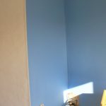 Här är ett lite konstigt hörn. Det fanns ett ”hål” i väggen efter de förra ägarna. De hade dolt det där hålet med garderober som vi inte ville ha. Någon tidigare ägare hade använt hålet som en bokhylla. Sambon och hans pappa satte dit en gipsskiva. Därefter har sambon och jag klätt hela rummet med EasyCover vilket gjorde väggarna jämna och fina. OK – arbetet kunde ha varit något snyggare gjort kanske – men det var faktiskt första gången! I hörnet finns det lite kopplingar till vatten och avlopp kvar. Dessa skall också döljas så småningom.