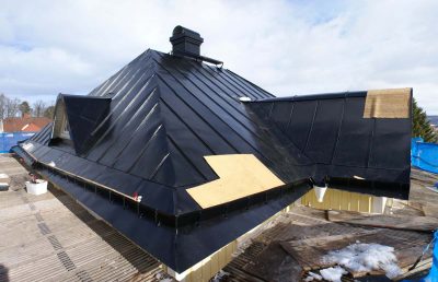 Nu börjar man verkligen vilja att taket ska vara färdigt. Och idag när jag pratade med takläggarna så visar det sig att slutet närmar sig med stormsteg. Nu har de faktiskt gjort i princip allting med taket. De börjar städa. Det är lite småsaker kvar samt ska avrinningen till stuprännorna fixas. Idag kom det också på en skorstenshuv. Jag har varit lite tveksam till det där med skorstenshuv och tegelskorsten, men jag måste erkänna att när både tak och skorsten är i plåt så blir det riktigt snyggt med en skorstenshuv.