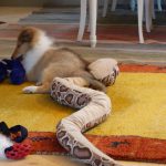 Knutan på bilden är Gandalfs knuta. Det var en av hans favoritleksaker. Den svängdes runt i munnen och kunde klämma i både kylskåp och annat. Och så skulle det kampas om den, Gandalf älskade att kampa och gärna om knutan. Han visste dessutom att den hette knutan. Vi brukade träna på att hämta olika saker genom att säga ”Hämta knutan”, ”Hämta råttan”, ”Hämta bollen” m.m.