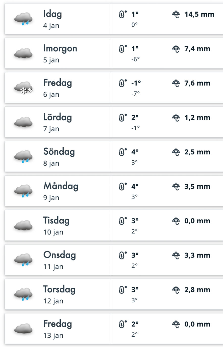 Vädret är tråkigt det också. Även om det just idag var uppehåll mitt på dagen. Jag tog en liten tur runt kvarteret. Kände att jag behövde lite luft. Men det var allt jag orkade. Ta mig runt kvarteret alltså. Det är plusgrader och det regnar nästan varje dag. Och även om det är bra för elräkningen så är det trist med regn nästan varenda dag.