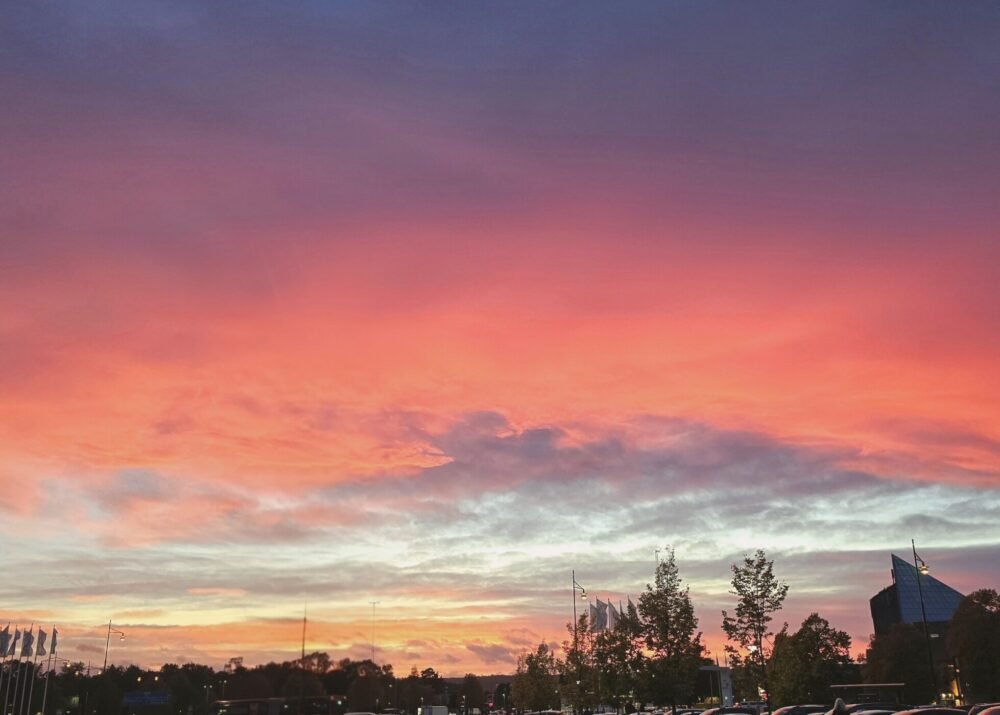 Maken var på ICA Maxi och handlade mat och skulle plocka upp mig på vägen. När jag var klar så hade jag inte så mycket mer att göra där så jag gick helt enkelt ut och satte mig på en bänk för att vänta på maken. Så fort jag kom ut såg jag en helt fantastisk solnedgång.