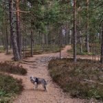 En stor fördel jag har nu för tiden är att jag kan gå ut mitt på dagen även mitt i veckan. Då kan du ha sådan tur att det är bara du, eller väldigt få människor på dina promenadstråk. Idag mötte jag två människor på sex kilometer, det är inte så mycket. Det innebär också att Ville kan få gå i långlina. Där vi gick idag är ett naturreservat, så han får inte gå lös, men långlina är nästan som att gå lös. Inte för att jag skulle ha honom lös nästan någonstans. Så mycket koll har jag inte på honom. Han är duktig och relativt lydig, eftersom maken tränar mycket med honom, men jag litar inte på att han alltid kommer när jag ropar Kom.