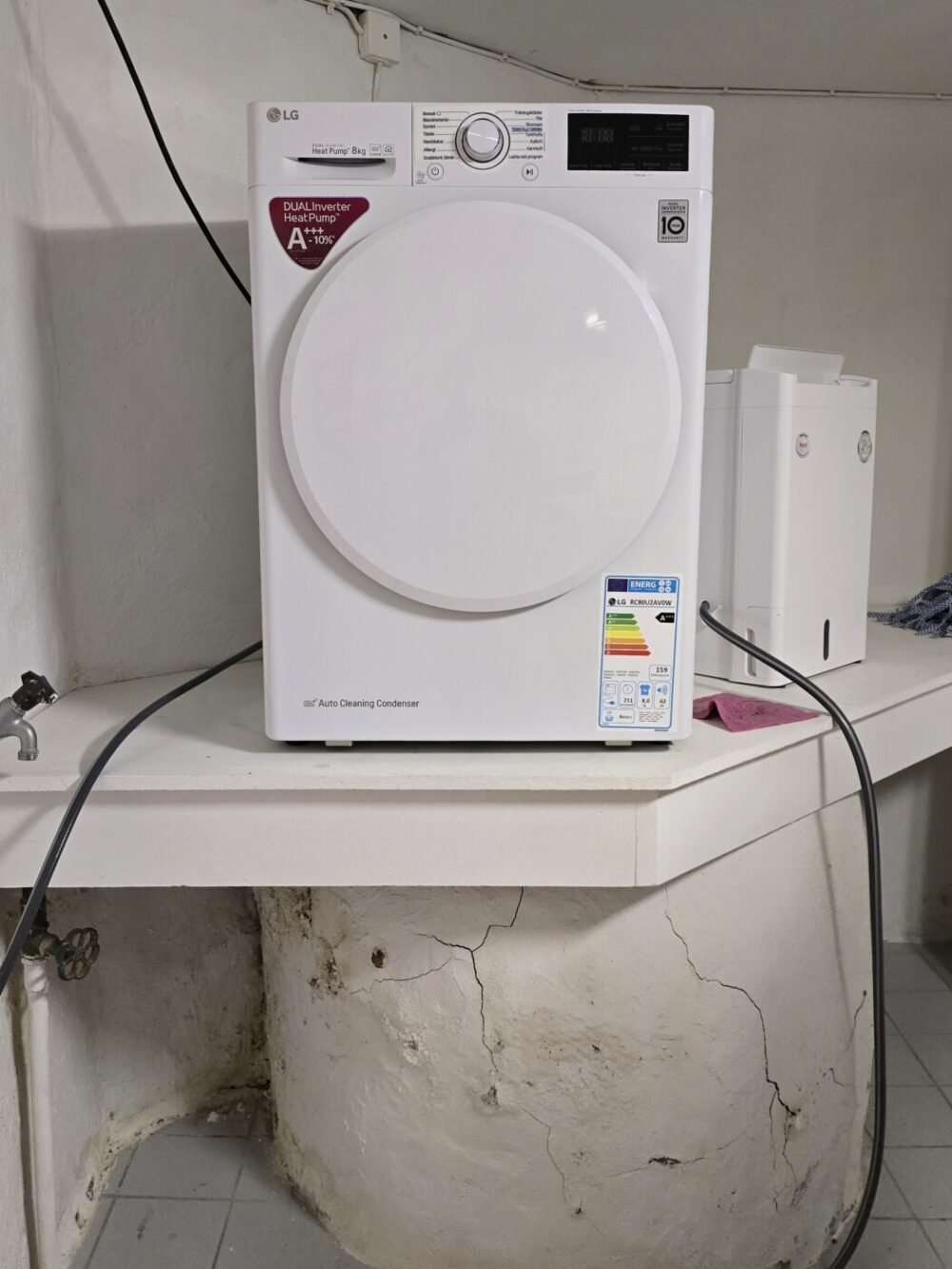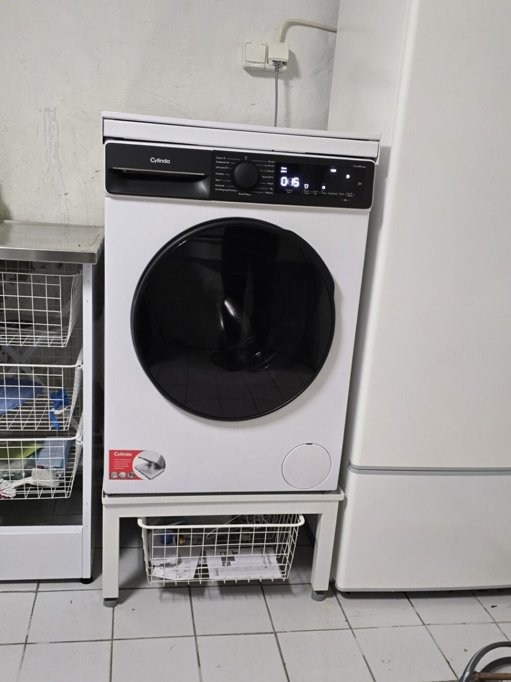 Kanske får vi fixa det där med att ha den ovanpå tvättmaksinen vid ett senare tillfälle. Det beror lite på. Det är nog ganska praktiskt att använda den där den står, men den gamla tumlaren hördes upp i vårt vardagsrum. Den var i och för sig väldigt högljudd, men jag vet inte om tvättunnan kommer att förstärka ljudet. Jag får lyssna och se om jag störs.