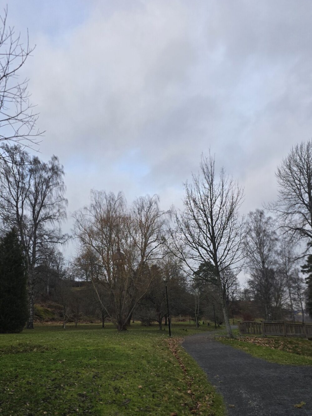 Nu är det inte många dagar kvar till det vänder. På söndag är det årets mörkaste dag och sedan blir det lite ljusare dag för dag. Och jag längtar efter det. Idag tog jag och Ville en långpromenad. Mulet väder så klart. Men när vi gick där så såg jag att det faktiskt syntes lite blå himmel mellan molnen på sina ställen.