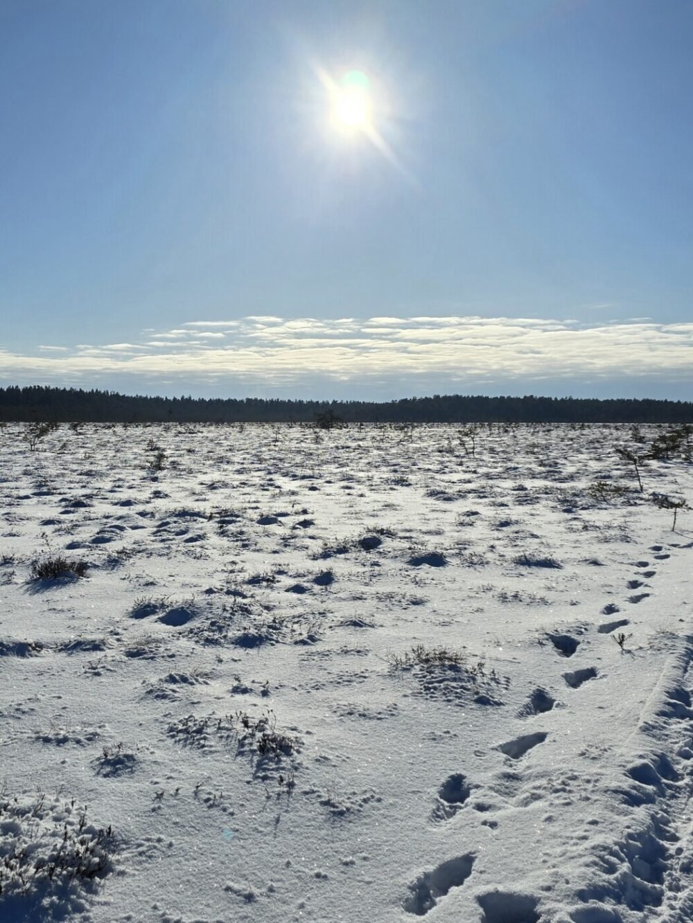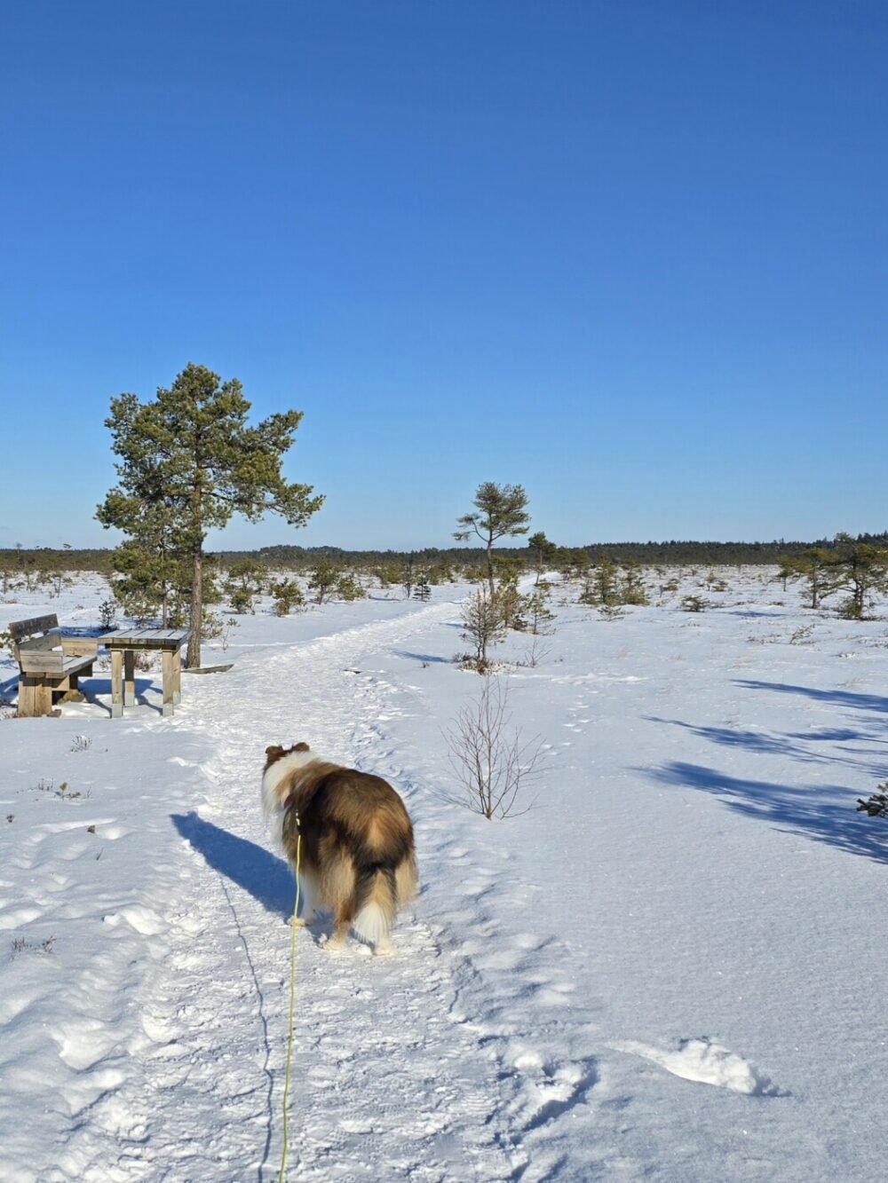 Jag tillhör inte heller dem som tycker att det blir ljusare bara för att det ligger snö. Jag behöver blå himmel och sol. Februari brukar normalt sett vara en ganska solig månad här. Något att gå och längta efter. I år icke. Forsatte med grått, grått. Men nu i helgen slog det till. För att kunna njuta ordentligt och få en släng D-vitaminer tog jag Ville i bilen och åkte till mossen. Det är ett väldigt bra ställe när solen skiner.