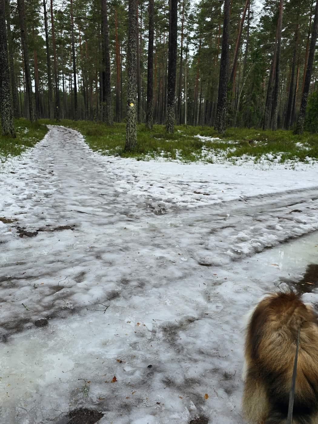 I år har vi haft en ovanligt kall och stabil vinter här. Det innebär att sedan Felix flyttade hit så har det varit snö här. Och det är i snö han har lärt sig gå ut och uträtta sina behov. Nu smälter snön bort och Felix känner sig lite vilsen när han ska gå ut och göra vad han ska. Vart ska han ta vägen?