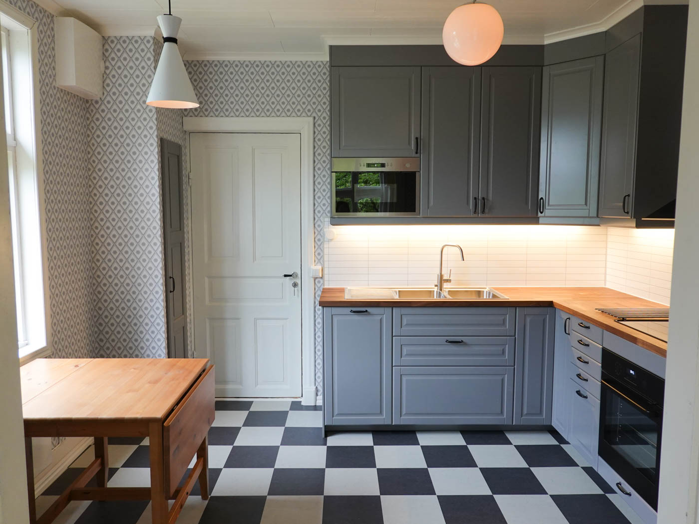 En målare har tapetserat vardagsrum och matrum. Plus målat om taken i båda rummen.